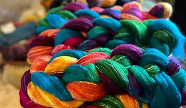 Offering natural hand-dyed artisan fibers and tools for spinning, weaving, and knitting.